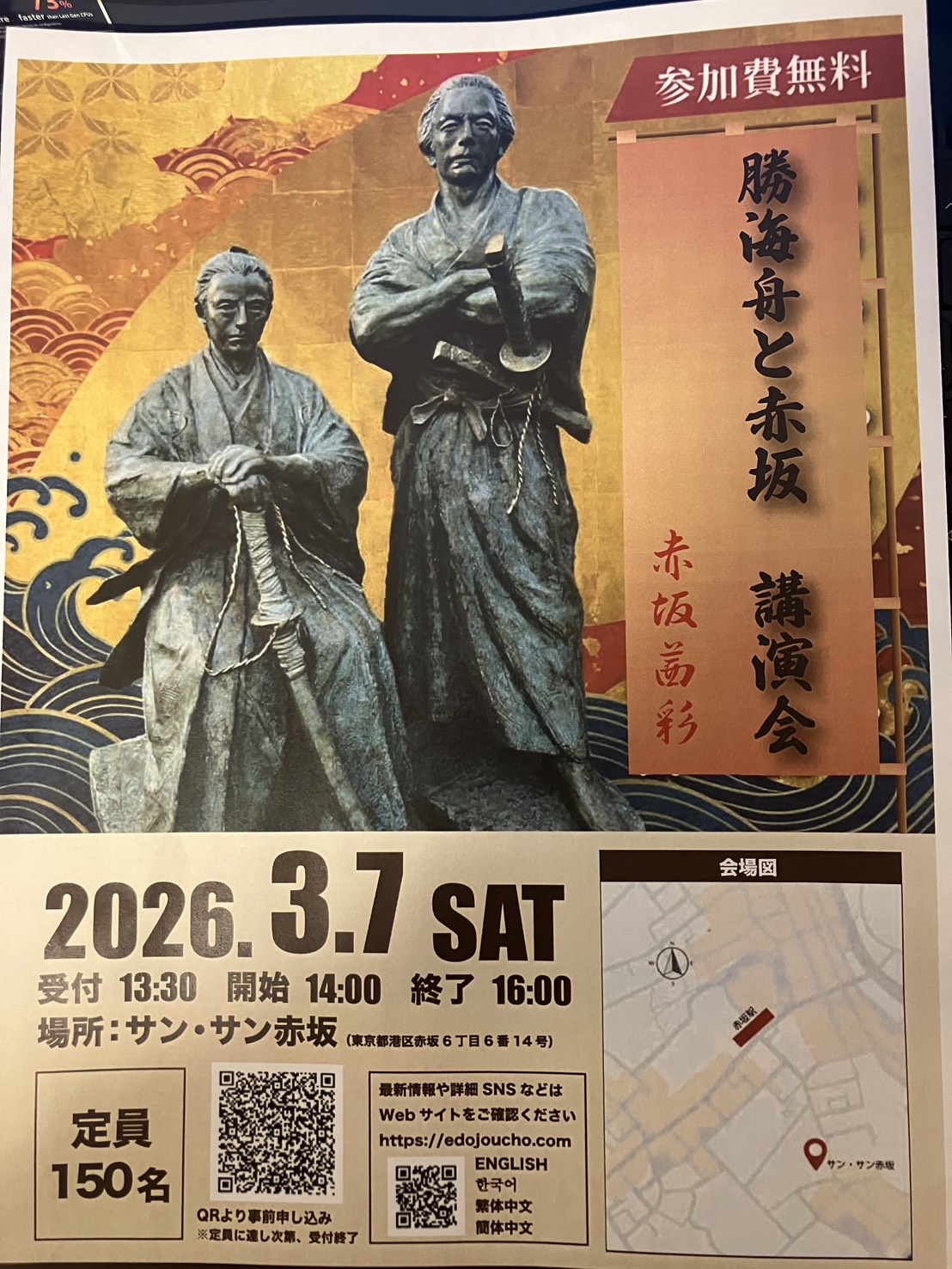 勝海舟と赤坂講演会 2026-03-07 関連行事に参加します。 「勝海舟と赤坂講演会」 主催:赤坂茜彩 期日:令和8年3月7日(土) 受付13:30 開会14:00~16:00閉会 会場:サン・サン赤坂 参加費無料 松下歴史塾塾生の参加登録は、グループラインにて Post Share LINE RSS note