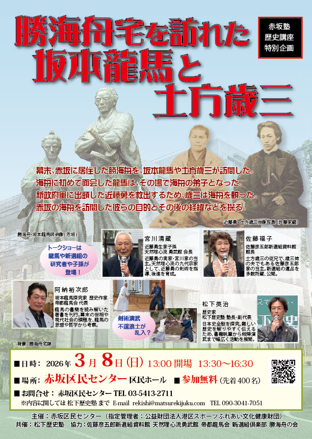 ▲題名:赤坂塾歴史講座特別企画「勝海舟宅を訪れた坂本龍馬と土方歳三」